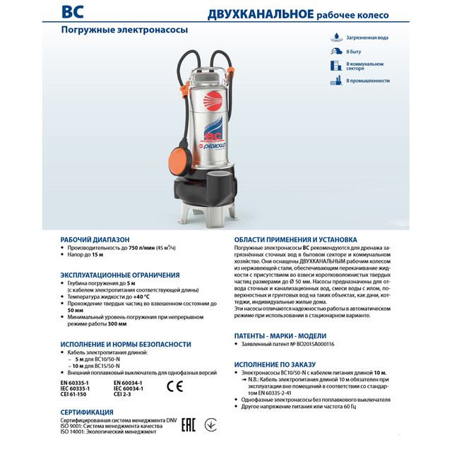Погромливі насоси BC рекомендуються для підйому води з високим рівнем забруднення, використовуватися у домашньому та комунальному господарстві. Вони оснащені ДВУХКАНАЛЬНИМ робочим колесом з нержавіючої сталі, яке забезпечує перекачку рідин зі своєю присутністю у ввісі коротковолокнистих твердих часточок діаметром до 50 мм.